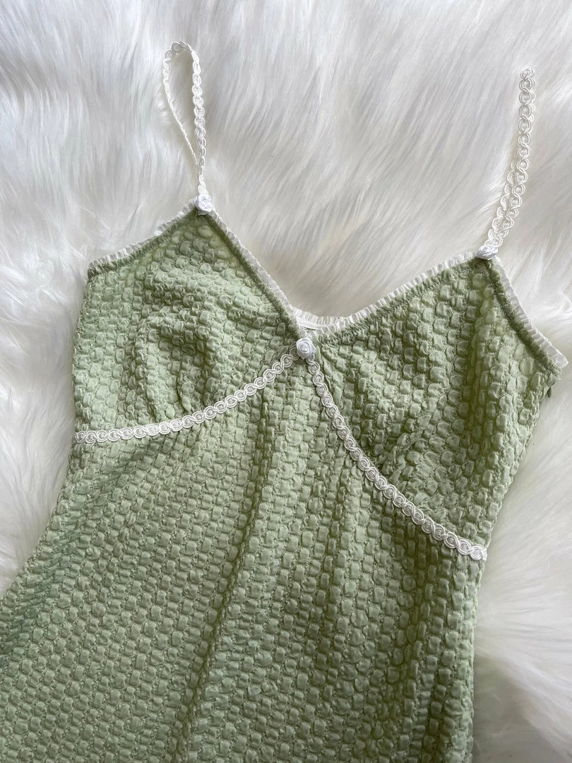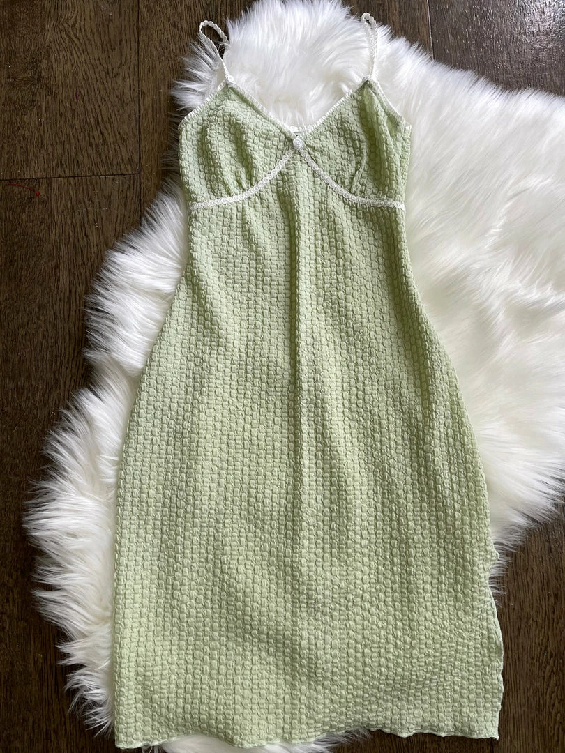 Very stretchy and thin knit material. Form fitting and pullover with white lace trims.