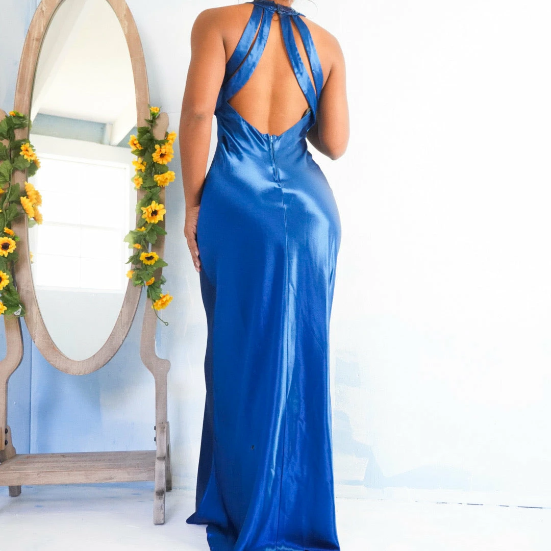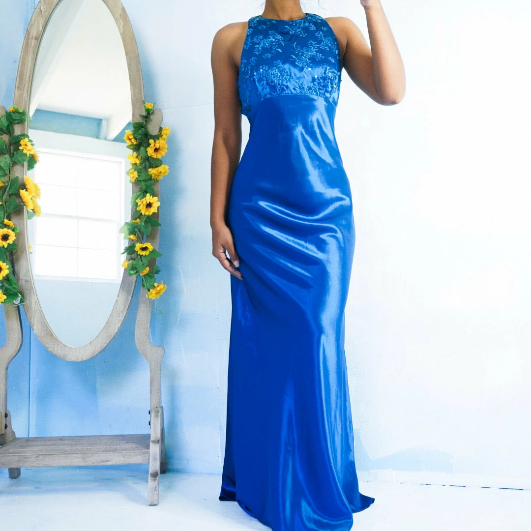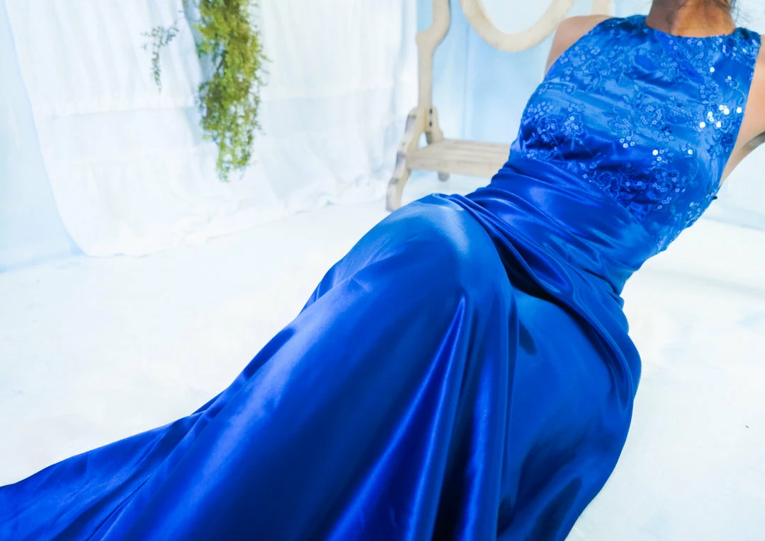 Non stretch material. Faux satin. Has a zipper closure and buttons on the back of the neckline.