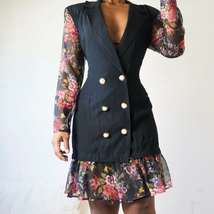 Non stretch. Has button closures and shoulder pads. Close fitting.